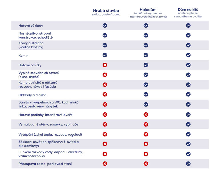 Rozdíl mezi hrubou stavbou a domem na klíč je hlavně v tom, v jaké fázi je dům připravený k užívání. Dům na klíč znamená, že se můžete prakticky hned nastěhovat. V ceně bývají hotové podlahy, interiérové dveře, kompletní koupelny, osvětlení i všechny funkční rozvody. Hrubá stavba je naopak jen základ domu. Zahrnuje konstrukční část, tedy základy, nosné zdivo, stropy, schodiště, krov, střechu nebo komín. Dům už má svůj tvar.