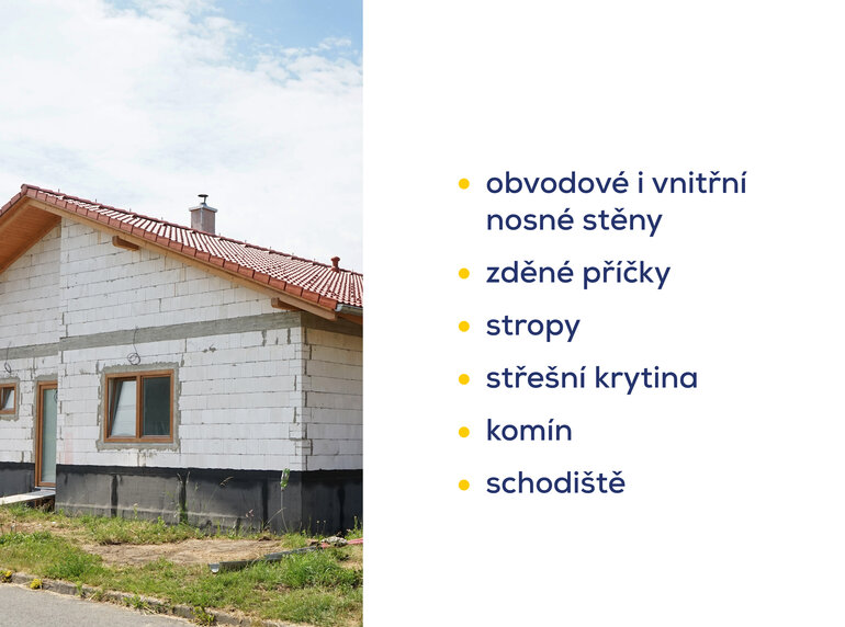 Do hrubé stavby patří obvodové i vnitřní nosné stěny, zděné příčky, stropy, schodiště, komín a krov včetně střešní krytiny.