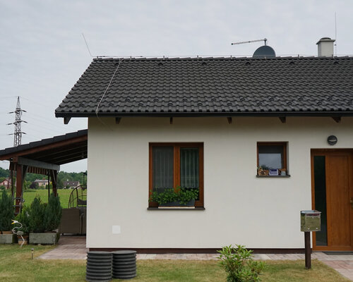 Poctivá stavba se sedlovou střechou a bílou fasádou. Žádné zbytečné okrasné prvky – jen funkční dům, co dává smysl.