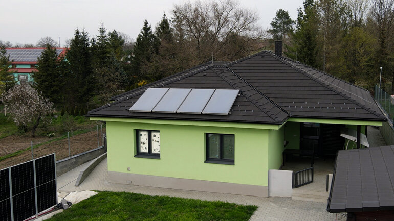 Pokud řešíte, jak na vytápění a větrání, uvažujete o termice nebo fotovoltaice, mohly by vás zkušenosti z Domanína zaujmout. To všechno zde totiž najdete. Vyzkoušené a plně funkční. Dům může být vytápěn buď tepelným čerpadlem vzduch / voda, nebo krbovými kamny. Systém obsahuje akumulační nádrž, z ní je teplo předáváno do podlah. Dům disponuje fotovoltaickým i termickým ohřevem vody, vše doplňuje rekuperace. Tu majitel instaloval až později, stejně jako fotovoltaickou elektrárnu se špičkovým výkonem 10 kW. Panely jsou součástí oplocení pozemku.